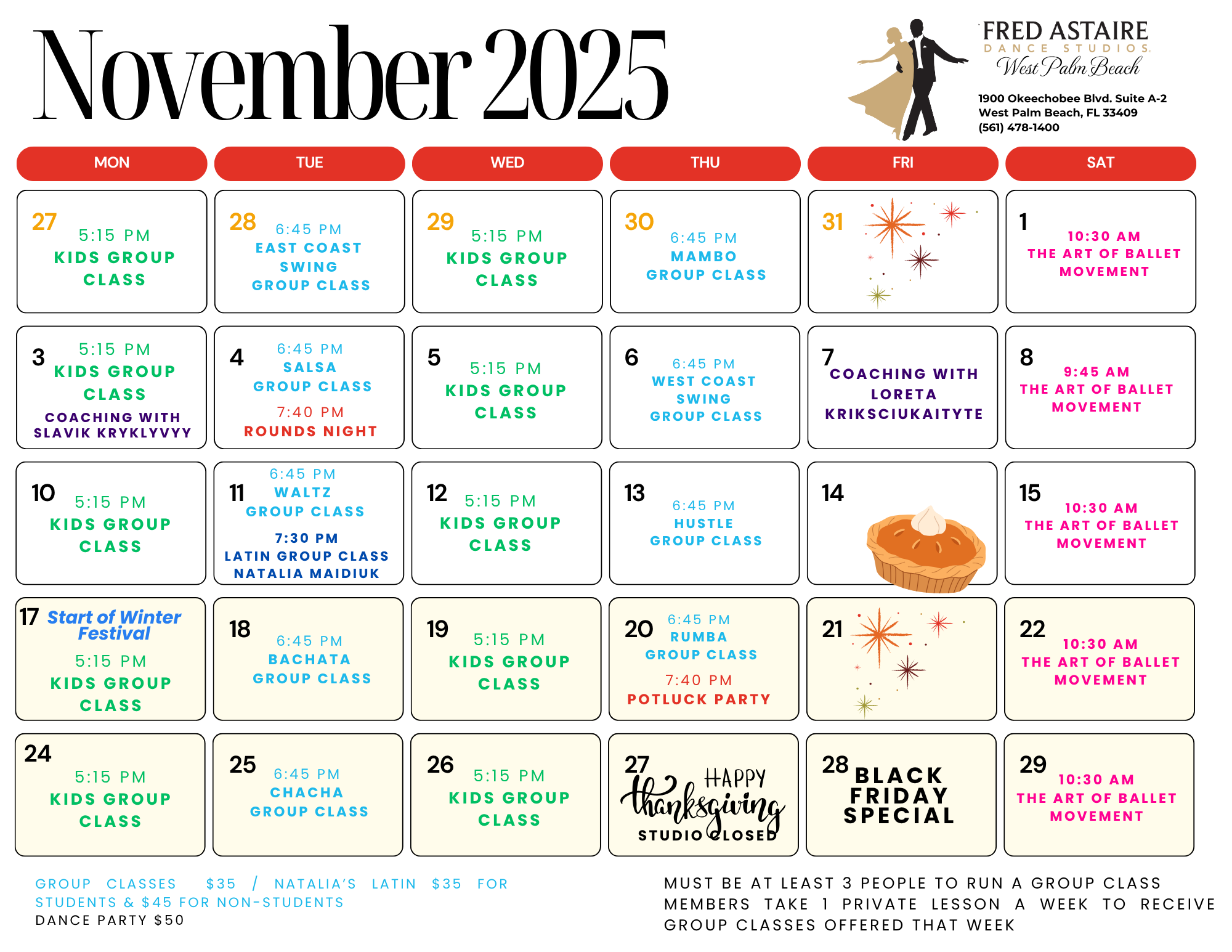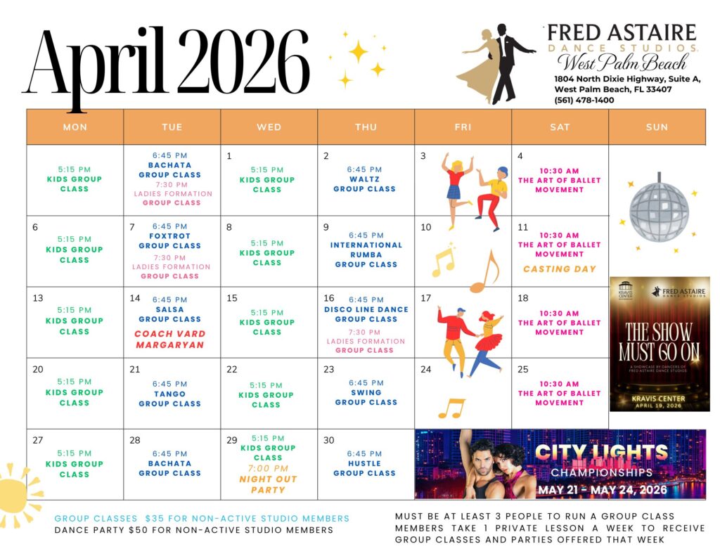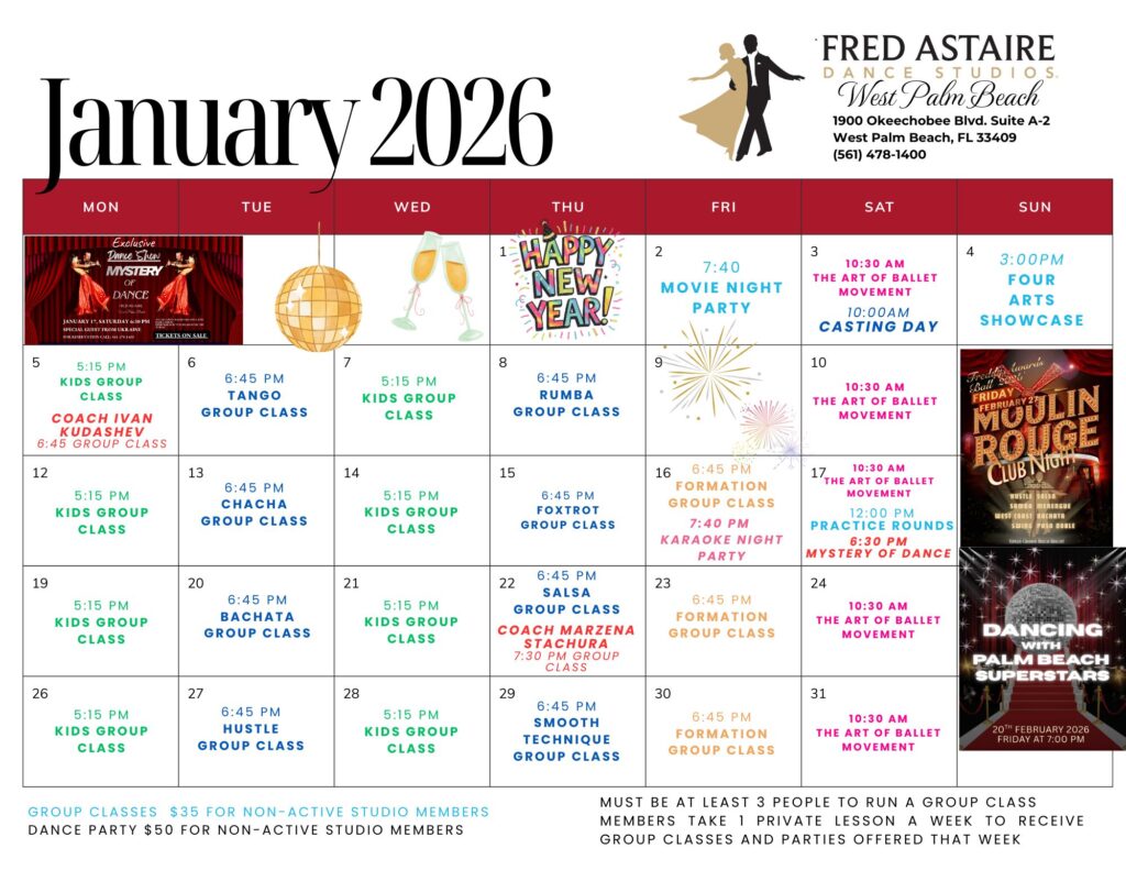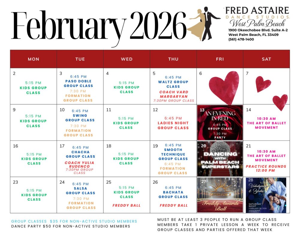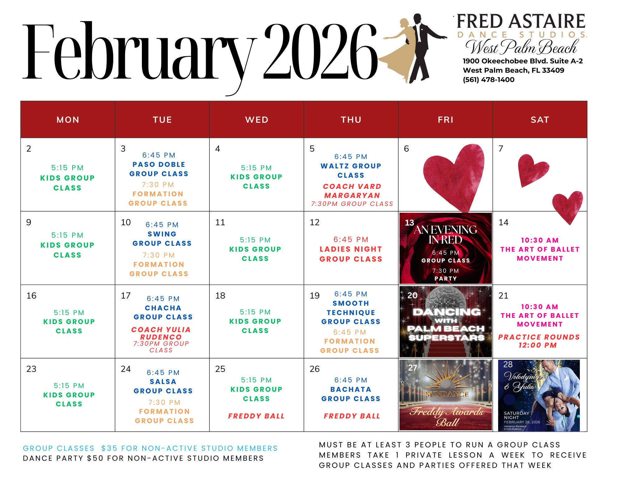 Below you will find our monthly calendar of events for Fred Astaire Dance Studio of West Palm Beach, including group classes, practice parties, and special events!