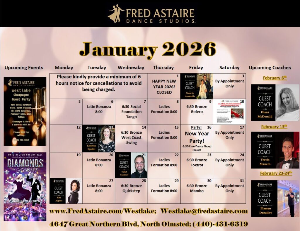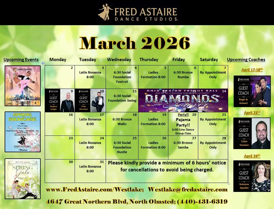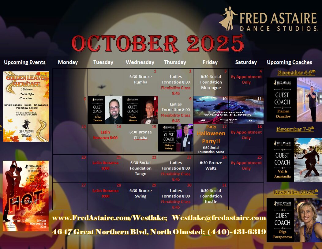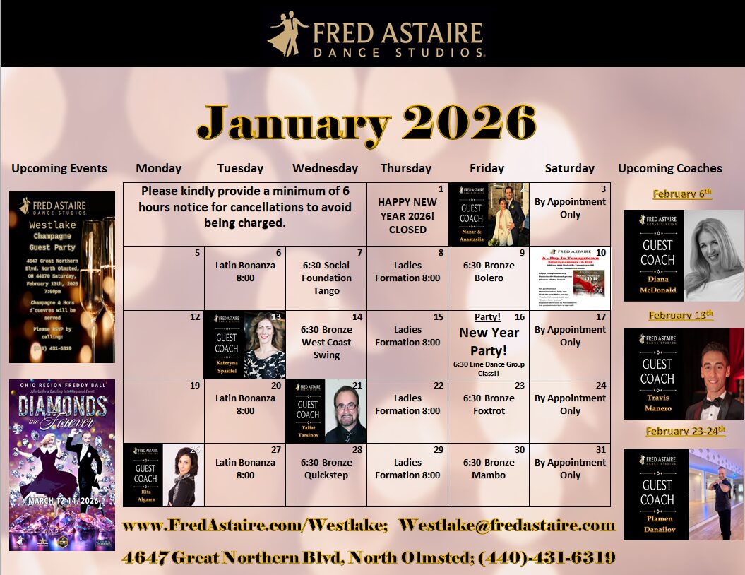 Our calendar is filled with lots of great opportunities to get you up and dancing! To get involved in our groups, parties, and other events please give us a call at (440)-431-6319.