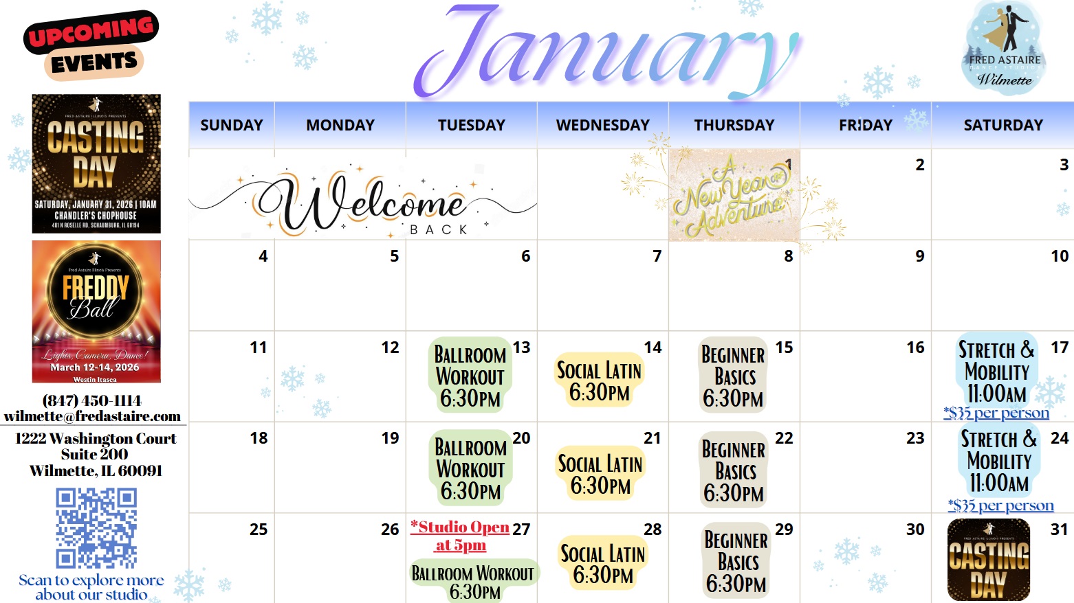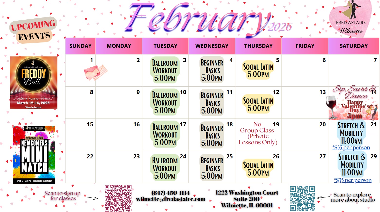 Below you will find our monthly calendar of events for Fred Astaire Dance Studio of Wilmette, including group classes, practice parties, and special events!
