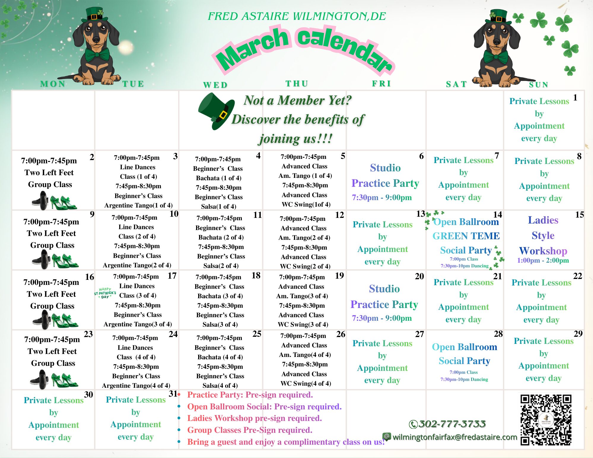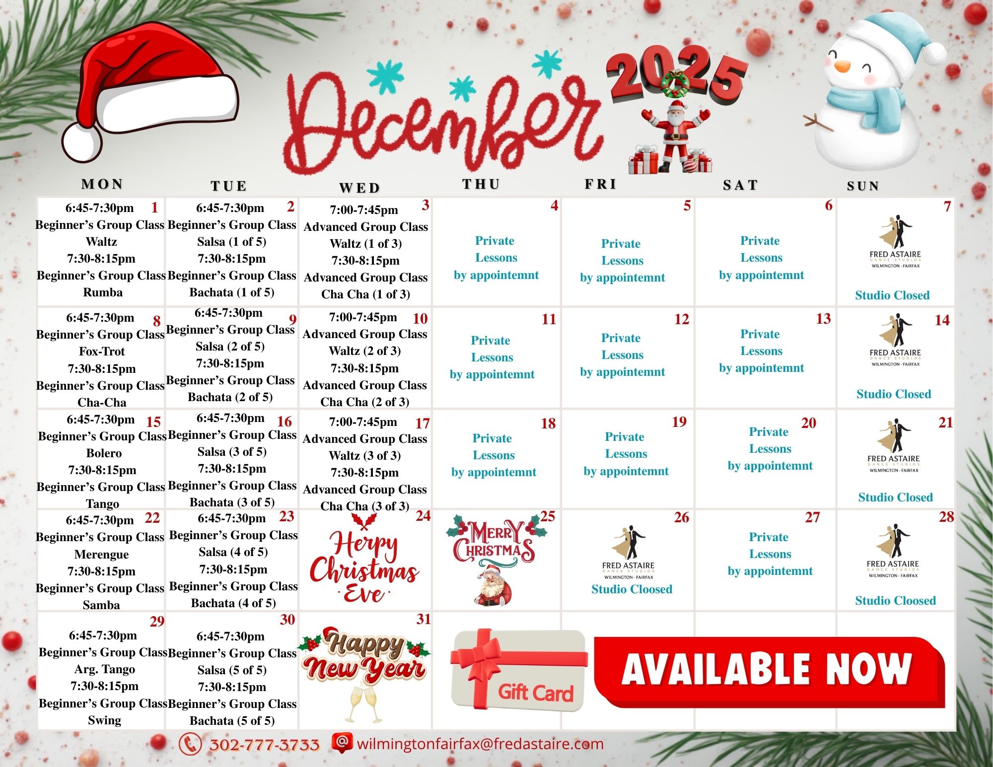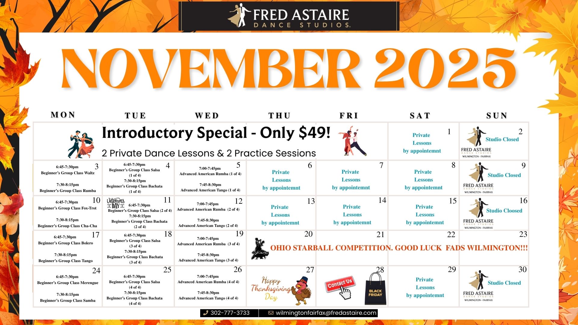 Below you will find our monthly calendar of events for Fred Astaire Dance Studio of Wilmington-Fairfax Delaware, including group classes, practice parties, and special events!