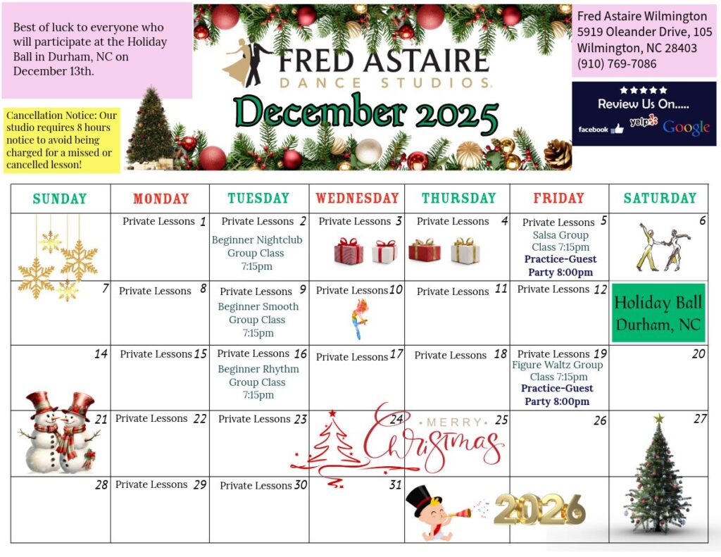 Check out this month’s schedule of Group Classes, Practice Parties and Special Events at our Studio. Come with a dance partner or by yourself. For more information and to join us, just give us a call!