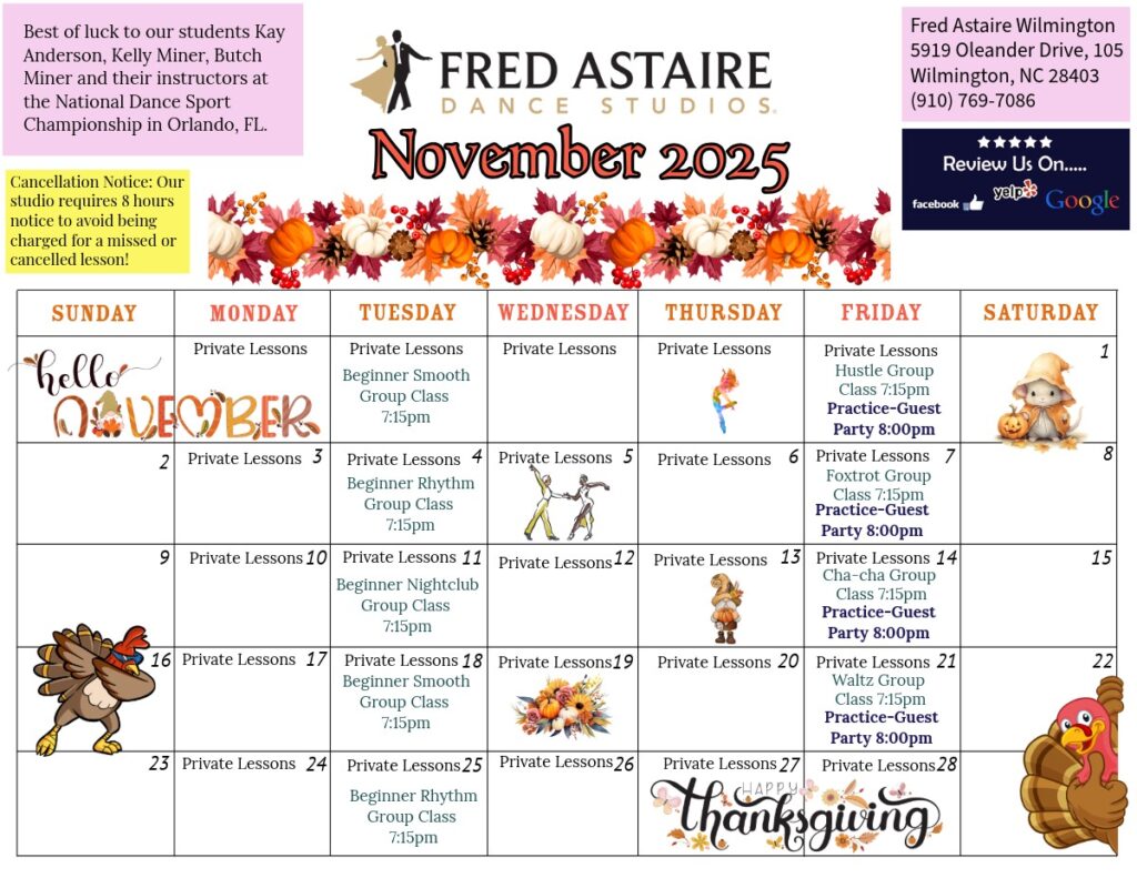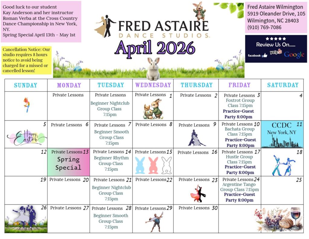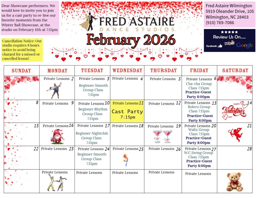 Check out this month’s schedule of Group Classes, Practice Parties and Special Events at our Studio. Come with a dance partner or by yourself. For more information and to join us, just give us a call!
